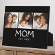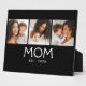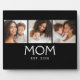 Black White Mum Established Typography 3 Photo Bold Modern Design - Give Mum the recognition she deserves with this fun black and white photo plaque. The word "MOM" appears in classic white typography on a black background, with the words "EST." ("Established") and the year below. Easily replace the three sample photo with your three favourite mum and baby photos. Edit the text to display one or more birth dates. Other short variants of "mum," such as "mum" or "mama," can be substituted. Makes a great gift for Mother's Day or Mum's birthday!