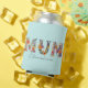 Pretty can cooler features watercolor floral letters that spell out M-U-M with customisable "extraordinaire" in modern script, on pastel blue background. Comes in 3 sizes for bottles, regular and seltzer cans!