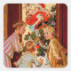 Funny vintage Christmas stickers featuring three curious kids watching mum kissing Santa Claus.
