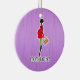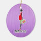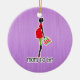 Adorable cute pregnant woman dressed to perfection for the holidays. She is wearing a headband, a stylish maternity top, and high heeled boots while holding a candy cane striped purse. Personalise this family ornament with custom name and Christmas date on the back. Special occasion and blessed event Christmas holiday ornaments from Ornament Central.