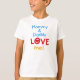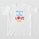 Mummy and Daddy Love Me T-shirts, long sleeve tees, sweatshirts,pullover hoodies, hats, ruffle shirts, sleeveless dresses, ruffle dresses, raglan T-shirts, football bodysuits, organic bodysuits, and other apparel for baby with text of red, blue, and gold with a heart that reads Mummy and Daddy Love Me!