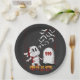 Playful bandaged mummy beside a Boo tombstone under a red starry rain. Bold orange text and retro cartoon vibe make it stand out on Halloween apparel and gifts.