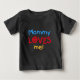 Mummy Loves Me dark T-shirts, long sleeve tees, sweatshirts, and pullover hoodies for baby with text of red, blue, and gold with a heart that reads Mummy Loves Me!