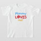 Mummy Loves Me T-shirts, long sleeve tees, bodysuits, organic bodysuits, sleeveless dresses, ruffle shirts, ruffle dresses, hats, raglan T-shirts, and other apparel for baby with blue, red, and gold text and heart design that reads Mummy Loves Me!