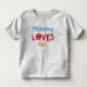 Mummy Loves Me T-shirts, long sleeve tees, bodysuits, organic bodysuits, sleeveless dresses, ruffle shirts, ruffle dresses, hats, raglan T-shirts, and other apparel for baby with blue, red, and gold text and heart design that reads Mummy Loves Me!