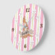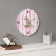 This adorable wall clock features a momma kangaroo and her baby, set on a background of pastel pink and yellow stripes. There is a thin green accent stripe and two white flowers complete the design. The banner across Mama Kangaroo can be personalised with your child's name or you can remove the banner and name. This clock is part of the "Mummy & Me Kangaroo Collection".