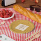 Looping honey bees fly over an amber gold paper plate to celebrate a baby shower for the Mummy to Bee, or a bumble bee birthday party for "Sweet as Can Bee" baby party, with a due date or event date using one or two lines of text.