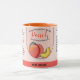 Mum's retro World Class Love Peach Jam Coffee Mug. Hand crafted Peach Jam packed with love form mum label. The perfect gift for Mother Day or Birthday. The cup design contains nutritional facts, Allergy information. and humbling mother like quotes.