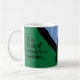 The customizable text says " If a flock of crows is a murder...does that make one crow a accessory or an accomplice?. It is accompanied by the black silhouette of a crow perched on a branch. The branch runs diagonally from top to bottom, dividing the mug. The background is green below the branch and blue above it. A silly gift for lawyers, birders, bird watchers, ornithologists, or those who like word games.