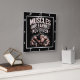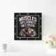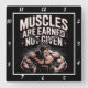 This black wall clock features the text "MUSCLES ARE EARNED NOT GIVEN" in a bold, slightly distressed white font. Below the text is a detailed graphic of a muscular individual, who appears to be a light-skinned man, flexing both arms. Rays emanate from behind the figure, emphasizing strength and effort. The design promotes hard work and dedication in fitness.