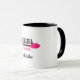 Motivational fitness mug that reads Muscles & Mascara with an image of a barbell on one end and a mascara brush on the other.