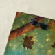 Cute image of two cats sitting atop a giant mushroom in a forest filled with mushrooms watching the autumn leaves fall against the sun and blue sky to create a wonderful storyland picture.