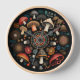 Cool mushroom art with black background. Stylised mushrooms in concentric pattern. Folk art style.