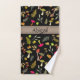 This lovely country chic hand towel has a black background with mushrooms in pink, orange and green. Interspersed are sprigs of foliage in greens and grey. Bright green beetles and orange snails give this design a whimsical tone. The towel can be personalised with your choice of a name or initials.
