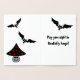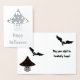 A cute vampire cartoon mushroom, with a black cap and red spots, and tiny fungal fangs. The inside and back feature vampire batshrooms. The front of the card reads "Happy Halloween" and the inside says "May your night be fiendishly fungal"