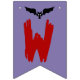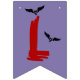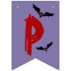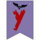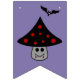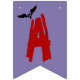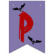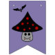 A banner with "Happy Halloween" in red on a purple background. Cartoon vampire mushrooms appear on two of the flags. Batshrooms (flying bat mushrooms) fly around the letters and vampire mushrooms.