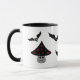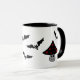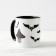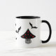 A cute cartoon vampire mushroom, with a black cap, red spots, and tiny fungal fangs. They are surrounded by vampire batshrooms.