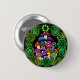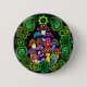A button with colourful psychedelic mushrooms surrounded by green paisley and green mandalas.