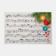 Sheet music with Christmas ornaments, green pine, and ribbon.