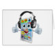 A cell phone cartoon mascot with big headphones on listening to music and giving a double thumbs up.