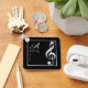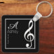 A stylish music themed design... cool idea to promote a music store... black and white keychains with a treble clef note and name of the musician