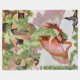 vintage fairylands illustrative painting with a beautiful lady faery with long reddish brown curly hair in a long green dress covered in clovers, large pink butterfly style wings, and clovers in her hair playing a large golden harp as tiny girl fairies and leprechaun faeries with green coats and black top hats dancing around in a circle.