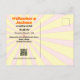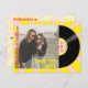 A unique wedding save the date postcard with a bright splash with a summer music festival feel, Your photo on a retro vinyl record album cover. The background is a bright sunburst in summer pink and yellow colours, coordinating with the text on the album cover and record label, which features your names, event date, and location. The reverse side of the postcard features the same burst as a background and has room for additional messaging about your big date, including a wedding website QR. Vintage 60s, 70s, 80s music fans. 12-inch LP look. Get your guests dancing to the music groove of your wedding!