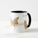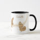 Silhouette butterfly images are filled with vintage music sheets on this pretty mug. Gold brown text at the bottom says "Music has wings", and your custom name is on the other side. Everything is placed on a white background, with a subtle gold star swirl among the butterfly images. Perfect for the musician, music teacher, or anyone who loves music!
