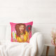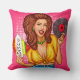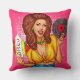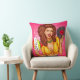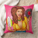 Throw pillow featuring a pop art illustration of an attractive smiling woman in tied shirt and jeans with vinyl record in hands.