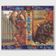 Oil painting by Flemish painter Jan van Eyck,The Ghent Altarpiece: Angels Playing Music and Annunciation Angel -1426-27 .Elegant,classic, bright and merry Christmas design on parchment with antique Florentine floral motifs and a shiny 3D blue sapphire and red ruby gemstones .