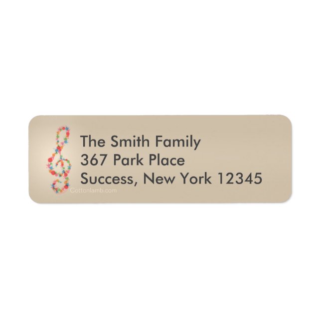 Multicolor splatters of paint arranged into a music note create this coordinating return address label.