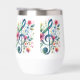 The image features a large treble clef symbol intertwined with various colourful flowers and leaves. The treble clef is predominantly dark blue with lighter blue accents, and is surrounded by an array of vibrant flowers in shades of pink, red, blue, and orange. Green leaves and stems weave through the design, adding a natural, organic feel. Small musical notes are scattered around the image, enhancing the musical theme. The combination of musical elements and floral motifs creates a visually appealing and harmonious composition.