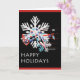 Big abstract white and blue snowflakes with white, blue and red notes on(and a little holly and berries, too) hidden inside, on a contrasting black background, wishing happy holidays to you and yours!