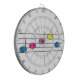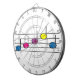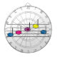 Music notes in pink, blue, purple and yellow on a music staff on a dartboard