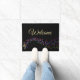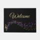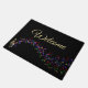 Music Notes Plume Black Welcome Mat Doormat. Colourful musical notes in festive holiday red, green, gold and lavender purple with a gold treble clef and customisable text on a black background. Perfect for outside your studio or home and a great gift for your favourite musician or music lover.