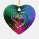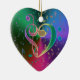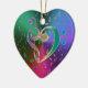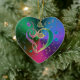 Music Notes Treble Bass Clef Heart Christmas Ornament. An explosion of rainbow musical notes on a metallic green, blue, purple and pink background with a with a rainbow coloured treble bass clef music heart. A great gift this holidays for your favourite musician or dance lover.