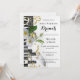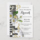 Post or after wedding brunch or lunch party invitation featuring a music themed design with a guitar, piano keys and musical notes in gold and lovely fresh white roses.