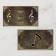 Music teacher business card designs with a grungy dark brown background, gold floral frame, ans music symbols.