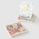 The coasters are gorgeous, a quality feel and heavy weight. They look like a precious archeological find. A rustic stone juxtaposed with a modern floral black and white print. I like the way the print goes slightly imperfect on the cut stone edges giving them a kind-of natural beauty.