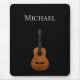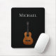 Cool Musical instrument mouse pad, with an acoustic guitar image set on a black background. With white customizable lettering, you can personalize with your own name. Great for adding a musical touch to your home office.
