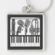 Keychain with a jazzy musical theme. Original drawing done in charcoal. Design made with parts of different musical instruments including a clarinet, upright bass, old style microphone, trumpet, piano, and drum stick.