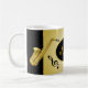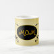 Musical mum's saxophone instruments coffee mug. For mother's with musical talents. Mum text in the centre over black and gold with musician theme.