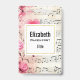 Name tag with a elegant and nostalgic design. Music sheet decorated with a big pink heart and pink roses and wildflowers around the edges.