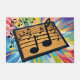 A brown doormat with black musical notes painted on it, surrounded by a colourful abstract background.