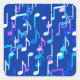A cascade of musical notes in turquoise, violet, pale pink, aqua and white on a deep indigo blue background