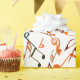 A cascade of musical notes in fuchsia pink, coral, peach red, black and cream on a light taupe tan background wrapping paper