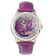 Colourful, whimsical,funny pink clown playing bugle with an expressive owl and joyful musical notes,flowers,leaves in vibrant red,fuchsia,violet,purple,blue,white colours, watercolor painting by Bulgan Lumini (c)