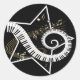 Unusual musical design featuring swirling piano keys with gold musical notes flowing from the centre of the keys on a black star. This design would make the perfect gift for the piano lover and is available on a collection of gifts and paper products. sgb01