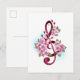 Pink treble clef with delicate, detailed pink Japanese cherry blossoms against white background painted over with light blue paint. Blooming pink sakura.