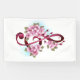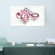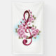 Pink treble clef with delicate, detailed pink Japanese cherry blossoms against white background painted over with light blue paint. Blooming pink sakura.
